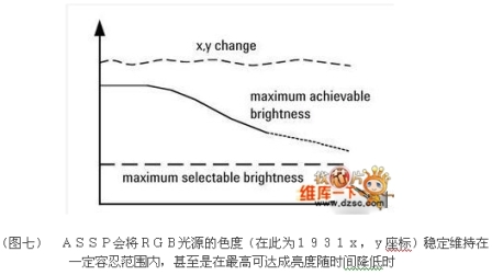 另一點(diǎn)相當(dāng)重要,同時(shí)必須注意的是,當(dāng)LED使用時(shí)間越久,光輸出強(qiáng)度就會(huì)降低,因此經(jīng)過一段時(shí)間后,RGB?。蹋牛南到y(tǒng)的最大可輸出亮度將會(huì)下降,雖然在大部分的應(yīng)用事實(shí)上都可以接受逐漸且穩(wěn)定的亮度衰減,但有時(shí)無法接受的是RGB發(fā)光系統(tǒng)色度的變化,ASSP擁有能夠穩(wěn)定控制RGB發(fā)光系統(tǒng)光度衰減的功能,例如維持色度的穩(wěn)定在一定的容忍度內(nèi),甚至當(dāng)最高可輸出亮度下降時(shí)。