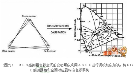 系統(tǒng)A中的三色光感測(cè)器在達(dá)成D65光輸出時(shí),會(huì)產(chǎn)生以上的電壓位準(zhǔn),但對(duì)系統(tǒng)B的光感測(cè)器,雖然達(dá)到和A系統(tǒng)一樣的D65光輸出,卻會(huì)產(chǎn)生不同的電壓位準(zhǔn)組合。換句話來說,由RGB感測(cè)器色彩空間所定義的色彩規(guī)格系統(tǒng)在每個(gè)系統(tǒng)都不一樣。