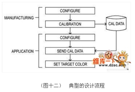 在生產(chǎn)階段,系統(tǒng)可以透過使用標(biāo)準(zhǔn)的CIE相機(jī)進(jìn)行調(diào)校,調(diào)校資料必須儲(chǔ)存在一個(gè)外部的短暫的記憶體中,而系統(tǒng)在導(dǎo)入到應(yīng)用后并不需要進(jìn)行調(diào)校程序。在應(yīng)用上,使用者首先對(duì)設(shè)備進(jìn)行組態(tài),接著將先前儲(chǔ)存的調(diào)校資料寫入調(diào)校暫存器,這是一個(gè)簡(jiǎn)單的讀出然后寫入的程序,完成后,系統(tǒng)就可以接受目標(biāo)色的輸入。