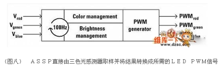 ASSP整合了一系列可以分析三色光感測(cè)器色彩資訊,并計(jì)算達(dá)成目標(biāo)色的設(shè)定點(diǎn)及PWM驅(qū)動(dòng)信號(hào)大小的一系列演算法。ASSP以大約每秒一百次的速度對(duì)光感測(cè)器進(jìn)行取樣,以確保PWM信號(hào)的持續(xù)定期調(diào)整不會(huì)被人眼察覺,如前面所提,ASSP同時(shí)也包含一個(gè)可以避免LED老化而造成RGB光源輸出色度改變的演算法。