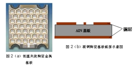LED封裝熱阻主要包括材料(散熱基板和熱沉結(jié)構(gòu))內(nèi)部熱阻和界面熱阻。散熱基板的作用就是吸收芯片產(chǎn)生的熱量,并傳導到熱沉上,實現(xiàn)與外界的熱交換。常用的散熱基板材料包括硅、金屬(如鋁,銅)、陶瓷(如Al2O3,AlN,SiC)和復合材料等。如Nichia公司的第三代LED采用CuW做襯底,將1mm芯片倒裝在CuW襯底上,降低了封裝熱阻,提高了發(fā)光功率和效率;Lamina Ceramics公司則研制了低溫共燒陶瓷金屬基板,如圖2(a),并開發(fā)了相應的LED封裝技術(shù)。該技術(shù)首先制備出適于共晶焊的大功率LED芯片和相應的陶瓷基板,然后將LED芯片與基板直接焊接在一起。由于該基板上集成了共晶焊層、靜電保護電路、驅(qū)動電路及控制補償電路,不僅結(jié)構(gòu)簡單,而且由于材料熱導率高,熱界面少,大大提高了散熱性能,為大功率LED陣列封裝提出了解決方案。德國Curmilk公司研制的高導熱性覆銅陶瓷板,由陶瓷基板(AlN或Al2O3)和導電層(Cu)在高溫高壓下燒結(jié)而成,沒有使用黏結(jié)劑,因此導熱性能好、強度高、絕緣性強,如圖2(b)所示。其中氮化鋁(AlN)的熱導率為160W/mk,熱膨脹系數(shù)為4.0×10-6/℃(與硅的熱膨脹系數(shù)3.2×10-6/℃相當),從而降低了封裝熱應力。