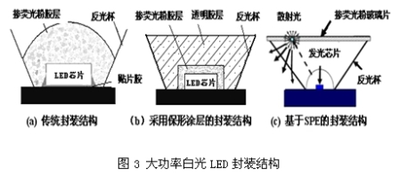 傳統(tǒng)的熒光粉涂敷方式是將熒光粉與灌封膠混合,然后點涂在芯片上。由于無法對熒光粉的涂敷厚度和形狀進行精確控制,導致出射光色彩不一致,出現(xiàn)偏藍光或者偏黃光。而Lumileds公司開發(fā)的保形涂層(Conformal coating)技術(shù)可實現(xiàn)熒光粉的均勻涂覆,保障了光色的均勻性,如圖3(b)。但研究表明,當熒光粉直接涂覆在芯片表面時,由于光散射的存在,出光效率較低。有鑒于此,美國Rensselaer 研究所提出了一種光子散射萃取工藝(Scattered Photon Extraction method,SPE),通過在芯片表面布置一個聚焦透鏡,并將含熒光粉的玻璃片置于距芯片一定位置,不僅提高了器件可靠性,而且大大提高了光效(60%),如圖3(c)。
