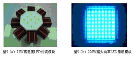 在系統(tǒng)集成方面,臺灣新強光電公司采用系統(tǒng)封裝技術(shù)(SiP), 并通過翅片+熱管的方式搭配高效能散熱模塊,研制出了72W、80W的高亮度白光LED光源,如圖5(a)。由于封裝熱阻較低(4.38℃/W),當環(huán)境溫度為25℃時,LED結(jié)溫控制在60℃以下,從而確保了LED的使用壽命和良好的發(fā)光性能。而華中科技大學則采用COB封裝和微噴主動散熱技術(shù),封裝出了220W和1500W的超大功率LED白光光源,如圖5(b)。