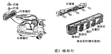 在車用燈具中,通常人們還將后轉(zhuǎn)向燈、制動燈、尾燈、后霧燈、倒車燈和行李箱燈等稱為輔助燈具,如圖3所示。