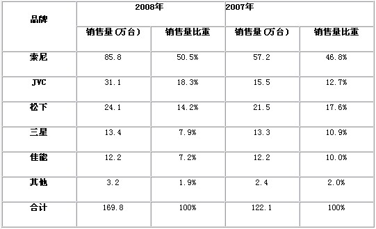 表2 2007-2008年中國數(shù)碼攝像機市場品牌銷售量結(jié)構