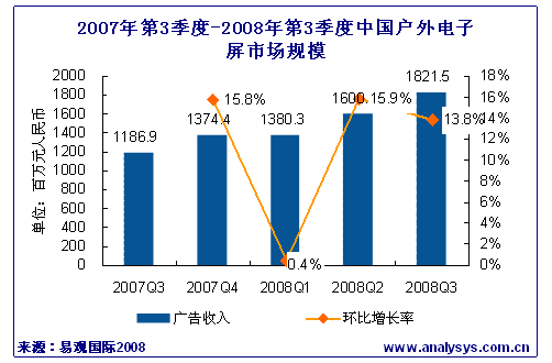據(jù)易觀國(guó)際最新報(bào)告《2008年第3季度中國(guó)戶外電子屏廣告市場(chǎng)季度監(jiān)測(cè)》研究結(jié)果顯示:2008年第3季度戶外電子屏廣告市場(chǎng)收入規(guī)模為18.21億,環(huán)比增長(zhǎng)13.8%,同比增長(zhǎng)53.5%。