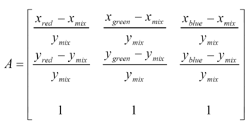 為您的系統(tǒng)設計LED控制機制,面對的是基本的線性代數。在得到您LED的色度坐標后,您必須先建立一個矩陣,找出所要色彩點之間的delta值,如公式1所示。公式中色彩下標字是LED的顏色,mix下標代表您想要呈現的顏色。