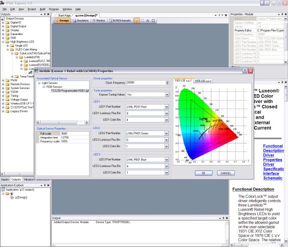 許多色彩系統(tǒng)設計擁有不同的回饋方法,需要花數個月的時間來開發(fā)韌體。解決bin的調整、溫度補償、或更高精準度的色彩回饋系統(tǒng)以及校正,都需要了解色彩科學以及精準的傳感器讀數。在展開任何高亮度LED設計時,強烈建議您先了解這些相關名詞。幸運的是,當您進入市場時,能利用Cypress Semiconductor所提供快速且輕易的PSoC Express 3.0解決方案,協(xié)助您快速展開研發(fā)。所有這些不同的回饋解決方案,以及高亮度LED的補償機制,都收錄在一個簡單易用的圖形化接口,讓您僅須使用下拉式選單以及各種校正技巧,就能完成這些設計。