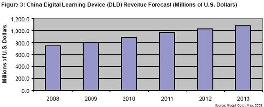 據(jù)iSuppli公司,隨著面向新用戶群的新型產(chǎn)品問世,2013年中國數(shù)碼學(xué)習(xí)設(shè)備(DLD)出貨額將上升到10億美元以上。DLD是提供數(shù)碼學(xué)習(xí)內(nèi)容的電子產(chǎn)品。