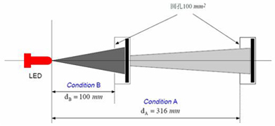如圖4所示,點光源光強在空間各方向均勻分布,在不同距離處用不同接收孔徑的探測器接收得到的測試結(jié)果都不會改變,但是LED由于其光強分布的不一致使得測試結(jié)果隨測試距離和探測器孔徑變化。因此,CIE-127提出了兩種推薦測試條件使得各LED在同一條件下進行光強測試與評價,目前CIE-127條件已經(jīng)被各LED制造商和檢測機構(gòu)引用。