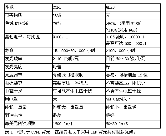 LED相對于CCFL的最大缺點(diǎn)是發(fā)光效率低,CCFL通常在80~100流明/瓦,而LED的發(fā)光效率只有60~80流明/瓦。但由于CCFL是圓柱形,它所發(fā)出的光是無方向性的。當(dāng)它放在LCD屏幕下方時(shí),盡管采用半圓形反光鏡,可以認(rèn)為仍然有相當(dāng)多的一部分光被浪費(fèi)掉了。而LED通常采用側(cè)光輻射,它的光可以比較有效地利用。因此從總體來看,它的效率仍然比CCFL要高,而且LED的發(fā)光效率還在逐年提高。