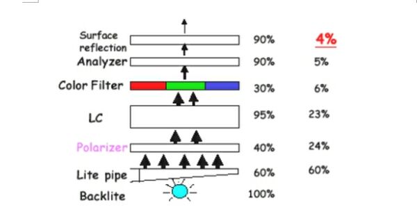首先,這種方法省去了彩色濾色片,而濾色片是光能的主要吸收者,它會損失光能70%以上。圖2表明了光能從光源出發(fā)以后所受到的損失。
