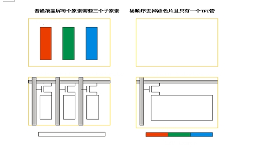 不僅如此,采用場順序以后,由于不需要再把每一個(gè)像素分為三個(gè)子像素,薄膜晶體管TFT也可以減少三倍,因此相當(dāng)于像素面積加大了三倍;或者說,如果保持像素面積不變,在相同的屏幕尺寸下,可以將分辨率提高三倍.