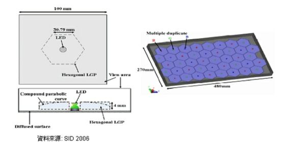 在2006年SID會議上,臺灣交通大學(xué)提出了一種整體上是直下式,而單個(gè)來看卻是采用側(cè)射式的LED,從而提高了其光線利用率,減少了所需LED數(shù)目并提高了效率。這種技術(shù)主要是采用側(cè)射式LED搭配以六角形導(dǎo)光單元.