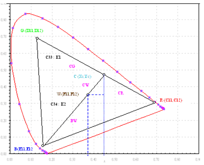 2. 尋找R、G兩種顏色配色后的座標(biāo)(已知R、G、B、W四點(diǎn)座標(biāo)計(jì)算BW直線的延長線的交點(diǎn)可得出C點(diǎn)座標(biāo)。