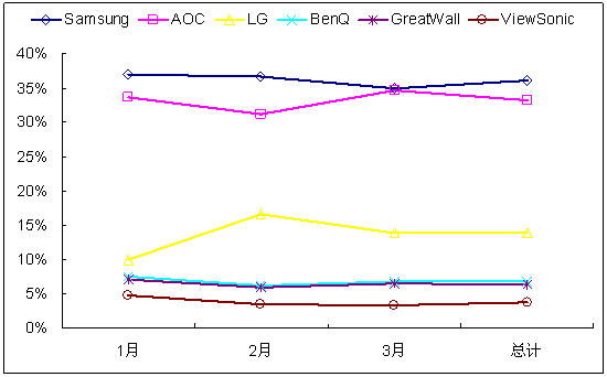 圖1 2009年1-3月中國LCD顯示器主流自有品牌市場份額變化