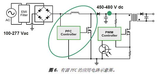 有源 PFC(見(jiàn)圖6)通常是作為一個(gè)專門的電源轉(zhuǎn)換段增加到電路中來(lái)改變輸入電流波形。有源PFC 通常提供升壓,交流100 至277 Vac的寬輸入范圍下,PFC 輸出電壓范圍達(dá)直流450 至480 Vdc。如果恰當(dāng)?shù)卦O(shè)計(jì)PFC 段,可以提供91%到95%的高能效。但增加了有源PFC,仍然需要專門的DC-DC 轉(zhuǎn)換來(lái)提供電流穩(wěn)流。