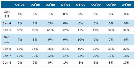 在2009年第二季,85%的筆記本電腦面板在5代線生產,而有11%在4代線或4代線以下生產,4%則在6代線生產。玻璃厚度成為筆記本電腦面板生產最關鍵的問題之一,而在5代線生產最為理想。根據(jù)面板廠的生產策略來看,生產比例規(guī)劃在接下來幾個季度將保持平穩(wěn)。