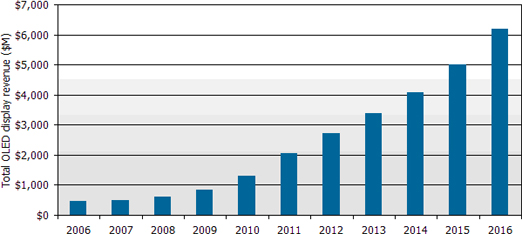 根據(jù)DisplaySearch最新發(fā)表季度OLED(有機(jī)發(fā)光二極管顯示器)出貨報告指出,第二季全球OLED出貨金額創(chuàng)新高達(dá)1億9千2百萬美元,較上一季成長32%,與去年同期相比成長22%。DisplaySearch預(yù)測全球OLED產(chǎn)值將從2008年6億美元,按每年33%復(fù)合成長率成長,估計到了2016年整體產(chǎn)值將達(dá)到62億美元;其中手機(jī)主屏仍是最主要的應(yīng)用,2016年出貨金額估計為30億美元,同時OLED TV產(chǎn)值將達(dá)20億美元,成為OLED第二大應(yīng)用產(chǎn)品。