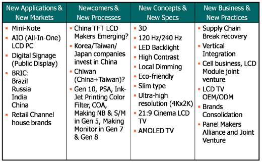 在接下來的十年將有八種因素主導著平面顯示器的成長: 新應用與新市場、新廠商與新制程、新潮流與新規(guī)格、新商業(yè)模式與新實踐方式(如圖二)。其中有許多項目是來自于各平面顯示器廠商在2008年底與2009年初這波景氣衰退中所得到的啟示;需求下滑與競爭日益激烈迫使廠商不斷的尋找新的策略、新的市場與新的解決方法,同時推動平面顯示產(chǎn)業(yè)不斷地前進。
