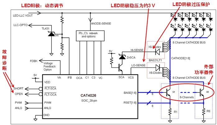 其它應(yīng)用,如建筑物照明中,同樣可以采用安森美半導(dǎo)體的高能效LED驅(qū)動方案,如CAT4103、CAT4109三通道線性恒流驅(qū)動器是高亮度RGB LED驅(qū)動器,應(yīng)用于新興的高亮度、高視覺沖擊力LED建筑物照明中的RGB LED像素控制。而CAT4106是多通道升壓型LED驅(qū)動器,適合較大尺寸的通用LCD背光應(yīng)用,能夠驅(qū)動多達(dá)40個白光LED,提供總計(jì)達(dá)6 W的LED輸出功率,并幫助設(shè)計(jì)人員提升背光能效至最高。此外,采用LED背光的大尺寸液晶電視日趨多,其中尤以側(cè)光式LED背光為主,通常需要采用6個單串的LED光條(每串LED視為一個LED道)?,F(xiàn)有6通道側(cè)光式LED電視中每個LED通道均含有專用驅(qū)動器IC、電感型DC-DC升壓轉(zhuǎn)換器及及開關(guān)。而安森美半導(dǎo)體應(yīng)用于大尺寸側(cè)光式LED背光液晶電視的多通道線性LED驅(qū)動器CAT4026是一種高性價比方案,支持高數(shù)量的通道,能以單顆IC控制6個LED通道,能效目標(biāo)范圍高于90%,能效典型值量多達(dá)94%,且針對 LED開路和過多LED短路等故障條件提供保護(hù)。CAT4026的簡略應(yīng)用示意圖參見圖2。