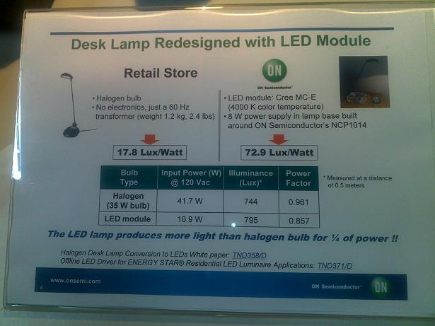 現(xiàn)場,Laurent為我們演示了用LED模塊代替鹵素臺燈在能效方面的差異,如下圖所示:可以看出,使用LED燈作臺燈的能耗僅相當(dāng)于鹵素?zé)舻?/4。