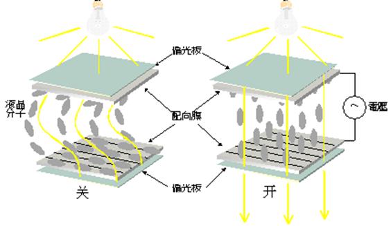圖2是液晶點陣(像素點)的工作原理圖,在沒有驅(qū)動信號的情況下,液晶分子按一定扭曲角排列,因此,光線很難通過液晶;在驅(qū)動信號的作用下,液晶分子就會被極化帶電,極化帶電的液晶分子就會按電力線的方向有序地進行排列,即扭曲角將會變小,這樣光線就很容易通過。液晶顯示器就是通過控制液晶分子的扭曲角大小,從而控制光的穿透強度來工作的。