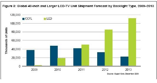 圖 3 所示為iSuppli 公司對40 英寸和更大尺寸液晶電視背光的單位出貨量預(yù)測,按背光類型細(xì)分,包括CCFL 和LED,涵蓋2009 到2013 年。