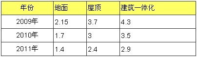 與此同時的各地政府也紛紛出臺政策刺激光伏電站的發(fā)展,杭州市提出“陽光屋頂”計劃,廣州,南昌,無錫,保定,上海紛紛提出了本地的光伏電站發(fā)展規(guī)劃,中國光伏最發(fā)達的江蘇省率先出臺了《太陽能光電建筑應用財政補助資金管理暫行辦法》,其中規(guī)定,通過3年努力,力爭在全省建成光伏并網(wǎng)發(fā)電裝機容量400兆瓦,2009-2011年分年度目標電價為: