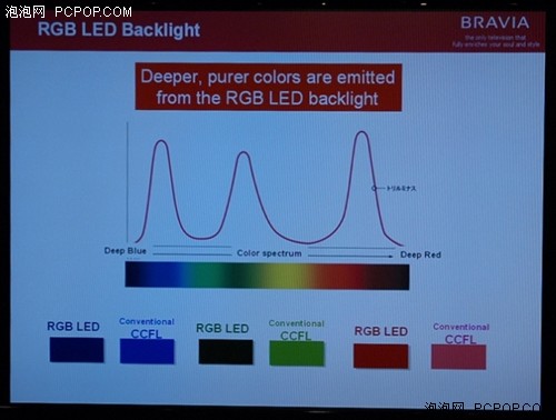 此外,RGB-LED在光譜特性上也大幅優(yōu)于CCFL。RGB三種LED發(fā)出的三原色光非常純正,能量高度集中.這點(diǎn)在最后的色域范圍方面體現(xiàn)的最為明顯。據(jù)工程師介紹,采用了“動(dòng)態(tài)麗彩LED背光源”的BRAVIA在實(shí)驗(yàn)室中測得的色域范圍已經(jīng)接近普通液晶的2倍,達(dá)到了一個(gè)前所未有的新高度。因此,的旗艦BRAVIA也實(shí)現(xiàn)了對最新廣色域標(biāo)準(zhǔn)x.v.Color的支持,如果配合使用支持x.v.Color色域的攝像機(jī)使用,消費(fèi)者將看到非常逼真自然的色彩和畫面。