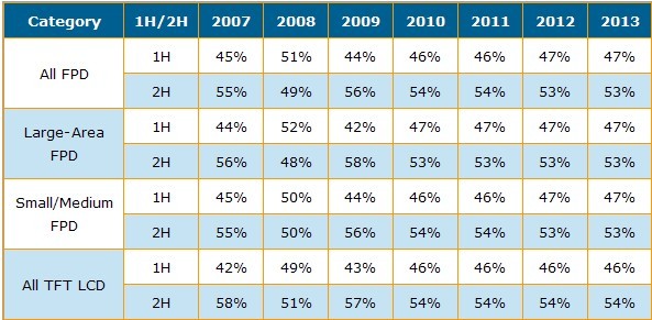 表一 2007-2013全球平面顯示產(chǎn)業(yè)上下半年市場(chǎng)份額