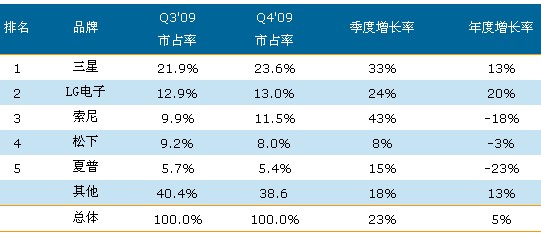 LG為2009年第四季的全球電視市場(chǎng)銷售金額的第二名,而在前五名之中LG是增長(zhǎng)最快的。LG的2009年全年銷售金額占有率達(dá)到了13.2%,較2008年整整增長(zhǎng)了2個(gè)百分點(diǎn)。