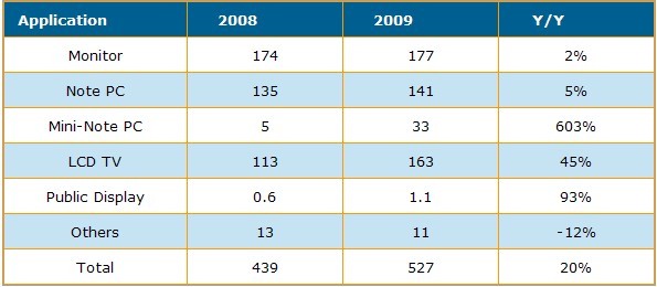 雖然液晶顯示器對大尺寸液晶面板而言是一個較成熟的市場,2009年出貨量僅較2008年成長2%,而與2007年相同。筆記型計算機與迷你筆記本電腦用面板合計出貨達(dá)一億7千500萬片,2009年年成長率約25%。電視面板表現(xiàn)最為亮眼,出貨量成長45%,達(dá)1億6千300萬片。另外,公眾顯示器面板出貨成長93%,從90萬片成長到110萬片。