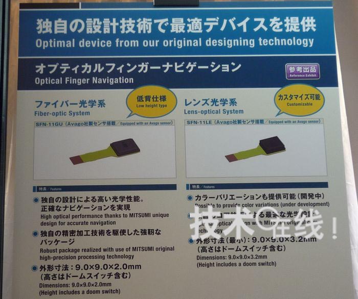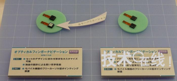 三美電機開發(fā)出了厚度僅為2mm的光學(xué)式輸入傳感器模塊“SFN-11GU”。設(shè)想用于用一根拇指在手機畫面上進行操作的用途。解說員表示,“如果是觸摸面板的話,大多數(shù)情況下需要一手拿著手機,用另一只手的手指碰觸畫面進行操作,而有些顧客希望可以只用單手進行操作”。該產(chǎn)品已經(jīng)用于便攜終端產(chǎn)品中。