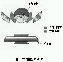利用這種原理可以針對(duì)觀視者觀賞畫面時(shí)的最適當(dāng)位置,除了提供觀視者左右兩眼影像之外,由影像正面的顯示區(qū)到最適距離所函蓋的區(qū)域,對(duì)觀視者而言就變成正常的立體三次元影像。不過(guò)兩眼視線相鄰處的影像,會(huì)被左、右兩眼在無(wú)意識(shí)狀態(tài)下捕捉讀取形成所謂的逆視領(lǐng)域,換句話說(shuō)使用這種三維立體影像分割器的觀視者必需固定在一定的觀視位置才能產(chǎn)生立體視覺(jué)效果(圖2)。