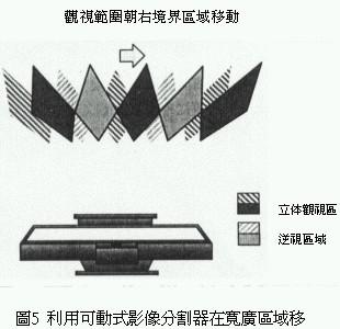 然而實(shí)際使用上頭部檢測(cè)系統(tǒng)時(shí),卻發(fā)現(xiàn)各菱形區(qū)域界面非長(zhǎng)狹窄,造成觀視者感受到微妙的重疊影像、失真(crosstalk)與黑色縱紋(moire)等觀視性不佳及眼睛極易酸痛疲勞反效果。有鑒于此SANYO將該系統(tǒng)改成由液晶所構(gòu)成的電子驅(qū)動(dòng)型可動(dòng)式頭部檢測(cè)系統(tǒng)(圖4),如果觀視者的頭部移動(dòng)至界面區(qū)域時(shí),該新型頭部檢測(cè)系統(tǒng)可以立即檢測(cè),同時(shí)移動(dòng)上述三維立體影像分割器的開(kāi)口部(圖5),也就是說(shuō)它是利用檢測(cè)器隨時(shí)偵測(cè)、監(jiān)控觀視者的頭部位置,并將偵測(cè)結(jié)果feedback給影像分割器,調(diào)整、控制液晶顯示器上所顯示的左、右兩眼的影像位置,利用這種新技術(shù)觀視者可以觀看到范圍極廣的三次元立體影像(圖6)。