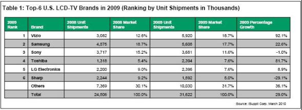 據(jù)iSuppli公司,Vizio在2009年成為美國市場的領先液晶電視品牌,而三星電子則在總體平板電視市場排名第一。