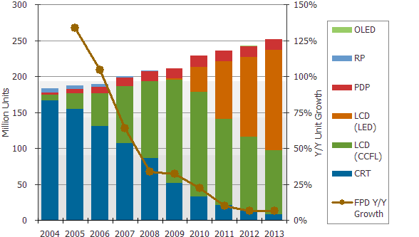 圖一:2004-2013全球電視市場按不同技術(shù)出貨量與平面電視年成長率(單位:百萬臺)