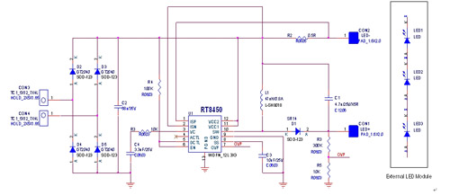 圖2:基于5WMR16LED燈與RT8450的驅動器電路板