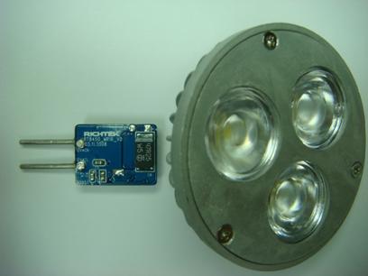 此外RT8450采用了非常小的WDFN封裝并具有4.5-40V輸入電壓范圍,這使得RT8450的驅動電路能提供很寬的驅動電壓范圍及輸入保護。RT8450的工作溫度高達125℃,可以在MR16燈具內(nèi)的高溫環(huán)境中安全地工作。其500kHz的開關頻率使驅動電路可以采用小尺寸的電感和電容,另外升降壓電路架構可以將輸入濾波電容容值降低,這樣便可以將驅動電路放置在MR16燈具中,如圖2所示。