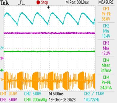 圖3:信道一為電子變壓器交流輸出電壓,信道二為經(jīng)過整流及濾波后的輸入電壓,信道三為交流輸入電壓,信道四為LED輸出電流。