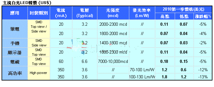 而在照明應(yīng)用的高功率LED部分,則由于亮度在70-90lm/W的供給增多,加上照明市場明顯增溫,廠商為擴(kuò)展市場佔有率,2010年Q1的照明用LED價格跌幅明顯大于背光用LED的價格。