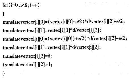 按上述投影算法計(jì)算出立體圖像對后,應(yīng)用OpenGL繪制立體圖像對,分別用紅、綠兩種顏色繪制右眼和左眼的圖像。以一個(gè)變長為10cm,中心點(diǎn)在原點(diǎn)的正方體為例,設(shè)兩視點(diǎn)間距離e為5cm,投影面距高觀察者d為40cm,考察正方體的一個(gè)頂點(diǎn)(5,5,5),由上述投影算法可得:xr=32cm,xl=48cm,yl=yr=4040cm,zr=zl=d=40cm對8個(gè)頂點(diǎn)分別計(jì)算后,連接相應(yīng)的立體透視投影點(diǎn),即可得該立方體的立體圖像對。用數(shù)組vertex[8][3]存儲頂點(diǎn),數(shù)組translatevertexr[8][3]存儲右眼投影計(jì)算后坐標(biāo),數(shù)組translatevertexl[8][3]存儲左眼投影計(jì)算后的坐標(biāo),對相應(yīng)的點(diǎn)進(jìn)行投影計(jì)算: