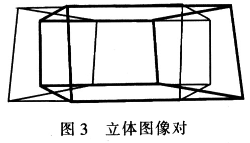 使用簡單的濾光鏡就可觀察有立體感的圖像。其原理是:由于濾光片(實(shí)驗(yàn)中使用紅、綠濾光片)吸收其他光線,只讓相同顏色的光線通過,因此左、右眼各透過不同顏色的光。當(dāng)使用濾光鏡觀察計(jì)算機(jī)屏幕上的立體圖像對時(shí),就會看到具有深度感受的圖像。在實(shí)驗(yàn)中發(fā)現(xiàn),刷新頻率對圖像立體效果的形成具有重要作用。刷新頻率過低,由于人眼所維持的圖像已消失,不能得到三維立體感受;刷新頻率過高就會出現(xiàn)一只眼睛可看到兩幅圖像的現(xiàn)象。將顯示的刷新頻率設(shè)置合適,在程序中設(shè)置圖像刷新頻率設(shè)置為50Hz,利用紅綠濾光鏡觀察模型的立體成像,得到較明顯的立體視覺效果。