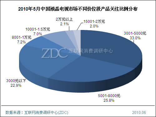 5月,3001-5000元的液晶電視產(chǎn)品吸引了33%的消費(fèi)者關(guān)注度,較上月升高了0.5%,而3000元以下的入門級(jí)液晶電視產(chǎn)品吸引了22.9%的消費(fèi)者關(guān)注度,較上月提高了2.6%。而5001-8000元價(jià)位段的大中尺寸液晶電視的消費(fèi)者關(guān)注比例較上月減少了4.1%。