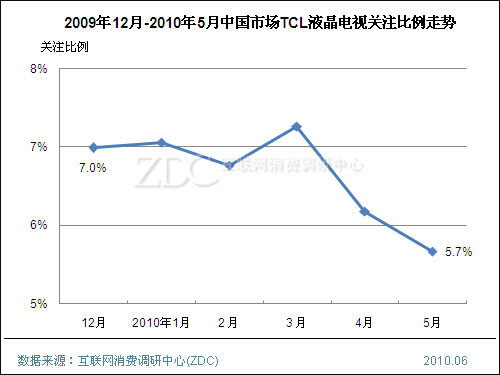 2009年,TCL在互聯(lián)網(wǎng)電視領(lǐng)域表現(xiàn)不俗,全年TCL液晶電視全球銷量為842萬(wàn)臺(tái),同比增長(zhǎng)了101%。在2010年第一季度TCL的品牌關(guān)注比例走勢(shì)平穩(wěn),但4月開始其品牌關(guān)注比例有小幅下滑,5月已經(jīng)下滑至5.7%,排名下滑兩位。