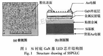 從結構圖中看出,Si襯底芯片為倒裝薄膜結構,從下至上依次為背面Au電極、Si基板、粘接金屬、金屬反射鏡(p歐姆電極)、GaN外延層、粗化表面和Au電極。這種結構芯片電流垂直分布,襯底熱導率高,可靠性高;發(fā)光層背面為金屬反射鏡,表面有粗化結構,取光效率高。[page]