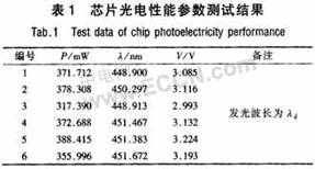 通過優(yōu)化Si襯底表面的處理和緩沖層結構,成功生長出可用于大功率芯片的外延材料。采用Pt電極作為反射鏡,成功實現大功率芯片的薄膜轉移。采用銀作為反射鏡,大大提高了反射效率,通過改進反射鏡的設計并引入粗化技術,提高了光輸出功率。改進了Ag反射鏡蒸鍍前p型GaN表面的清洗工藝和晶片焊接工藝,改善了銀反射鏡的歐姆接觸,量子阱前引入緩沖結構,提高了芯片發(fā)光效率,優(yōu)化量子阱/壘界面生長工藝,發(fā)光效率進一步提高,通過改進焊接技術,減少了襯底轉移過程中芯片裂紋問題,芯片制備的良率大幅度提高,且可靠性獲得改善。通過上述多項技術的應用和改進,成功制備出尺寸1mm×1mm,350mA下光輸出功率大于380mW的藍色發(fā)光芯片,發(fā)光波長451nm,工作電壓3.2V,完成課題規(guī)定的指標。表1為芯片光電性能參數測試結果。