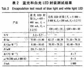 根據LED的光學結構及芯片、封裝材料的性能,建立了光學設計模型和軟件仿真手段,優(yōu)化了封裝的光學結構設計。通過封裝工藝技術改進,減少了光的全反射,提高了產品的取光效率。改進導電膠的點膠工藝方式,并對裝片設備工裝結構與精度進行了改進,采用電熱隔離封裝結構和優(yōu)化的熱沉設計,降低了器件熱阻,提高了產品散熱性能。采用等離子清洗工藝,改善了LED封裝界面結合及可靠性。針對照明應用對光源的光色特性的不同要求,研究暖白、日光白、冷白光LED顏色的影響因素:芯片參數、熒光粉性能、配方、用量,并通過改進熒光膠涂覆工藝,提高了功率LED光色參數的控制能力,生產出與照明色域規(guī)范對檔的產品。藍光和白光LED封裝測試結果見表2。表中:φ為光通量;K為光效;P為光功率;R為熱阻;μ為光衰;I為飽和電流。