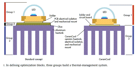僅優(yōu)化散熱器的作法很常見(jiàn)。目前已有上百種散熱器設(shè)計(jì),它們基本上都由鋁構(gòu)造。但為進(jìn)一步改進(jìn)性能,有必要提升甚至取消Group3。電氣隔離功能必須通過(guò)其它材料從散熱器本身獲得。我們認(rèn)為這種材料應(yīng)該是陶瓷。諸如Rubalit(氧化鋁)或Alunit(氮化鋁)等陶瓷材料將兩個(gè)關(guān)鍵特性:電絕緣和熱傳導(dǎo)結(jié)合在一起。